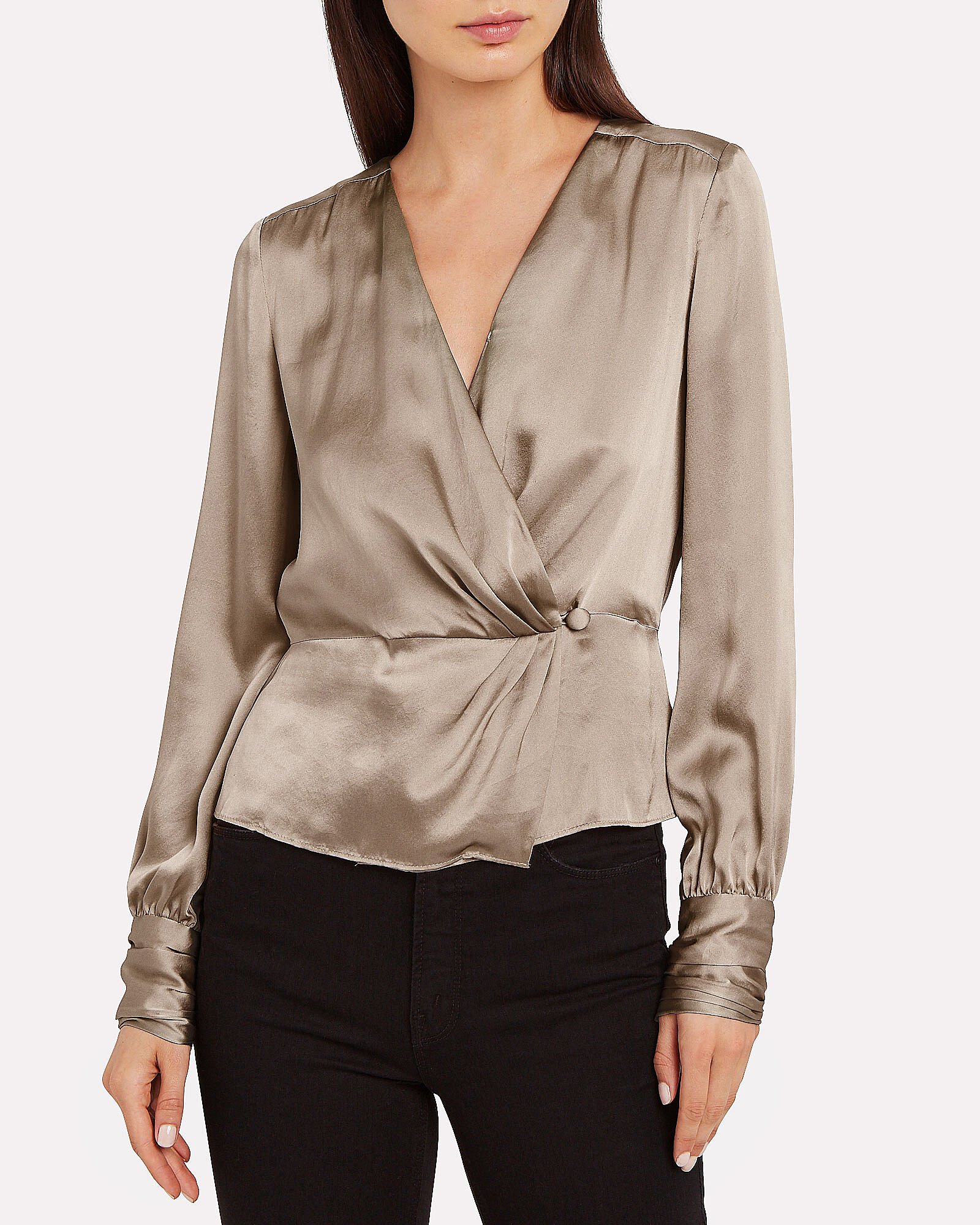 Where coordinating silk satin is concerned, you’d be hard pressed to find a mismatch. Soft tones like tan, dusty rose, and ivory evoke smart elevation and get along with a mélange of wardrobe staples: try a silk satin midi skirt in a natural print pattern to punctuate an otherwise fluid outfit with great dimension; or perhaps, perfect the art of minimal modern with a divinely drapey silk blouse that quietly stands out with anything from culottes to pencil skirts. And for the off-duty hours, a silk cowl neck cami—be it in black or beige—tucked into your favorite denim (yes, you can) lends chic, high-contrast impact that holds up even with a switch of a season. So, as you reevaluate your work-to-weekend rotation, be sure to throw one of these silky numbers into the shuffle for a fresh remix on the everyday. It’s a look that will never date—guaranteed.